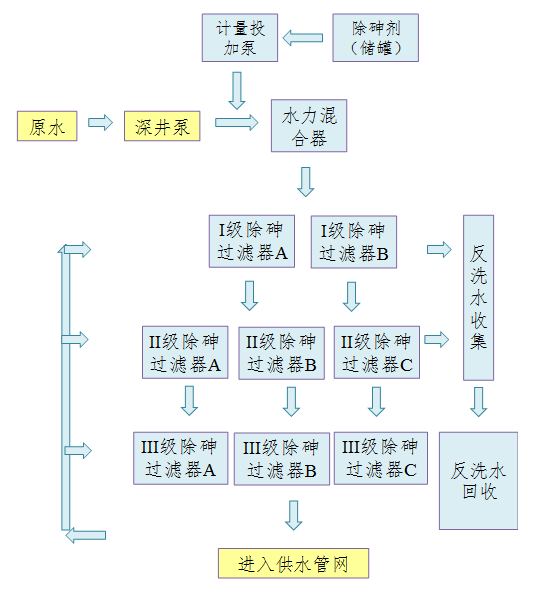 目前市场上处理砷超标饮用水主要利用膜过滤和活性氧化铝吸附工艺。利用膜工艺去除砷,只是利用物理原理将砷过滤截留,截留的砷存在于废水中排至市政管网,环境污染大,并且吨水的建设成本在6000元左右,运行成本在10元,废水产生率30-50%,在膜组件完好情况下,系统运行较为稳定,但经济效益较差,不适合经济欠发达地区使用。此外,前端投加的砷去处药剂对膜的使用寿命和化学反洗周期影响较大。活性氧化铝工艺除砷吨水的建设成本在2000元左右,运行成本在0.8-1.0元,运行过程中会出现板结、短流、易饱和、需再生、运行成本高、出水不稳定及尾水毒性强等情况。所以综合来看这两种除砷工艺都存在一定短板。我们采用的工艺相比较于传统的除砷工艺有以下几点优势:(1)技术优势,我们采用独特的改性滤料,针对不同程度砷超标配置不同的除砷剂和滤料,可高效处理不同程度的砷超标饮用水,确保供水安全。(2)节约优势,一般水厂中除砷设备废水率约为3-5%,本项目设备可高效利用水资源,运行过程中主体设备产生3-5%废水,但配备了回收系统,可将废水再次回收60-80%,最终的废水率不足1%。(3)成本优势,我们的设备材料成本略低于行业同类产品,吨水的建设成本在1500元左右,运行成本在0.6-0.8元,运行稳定,尾水砷浓度在市政污水处理厂可接受范围,技术综合效益良好。