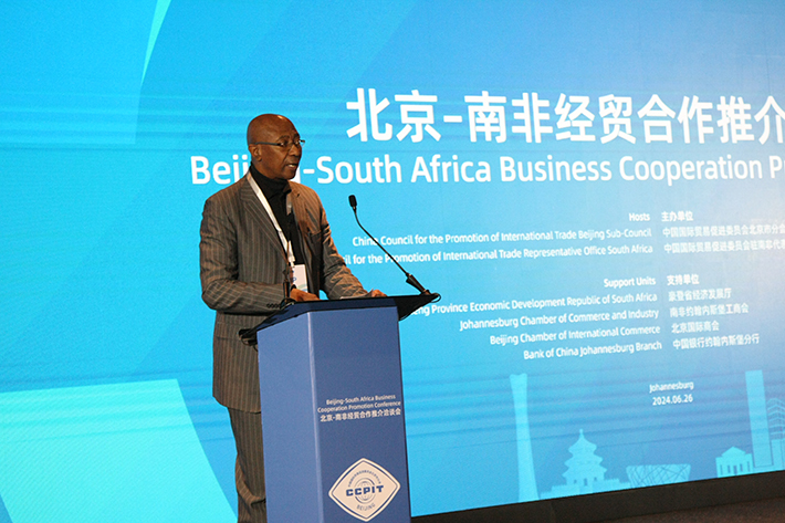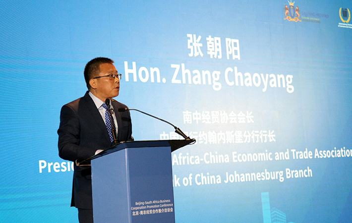 南中经贸协会会长、中国银行约翰内斯堡分行行长张朝阳讲话(北京市贸促会供图)