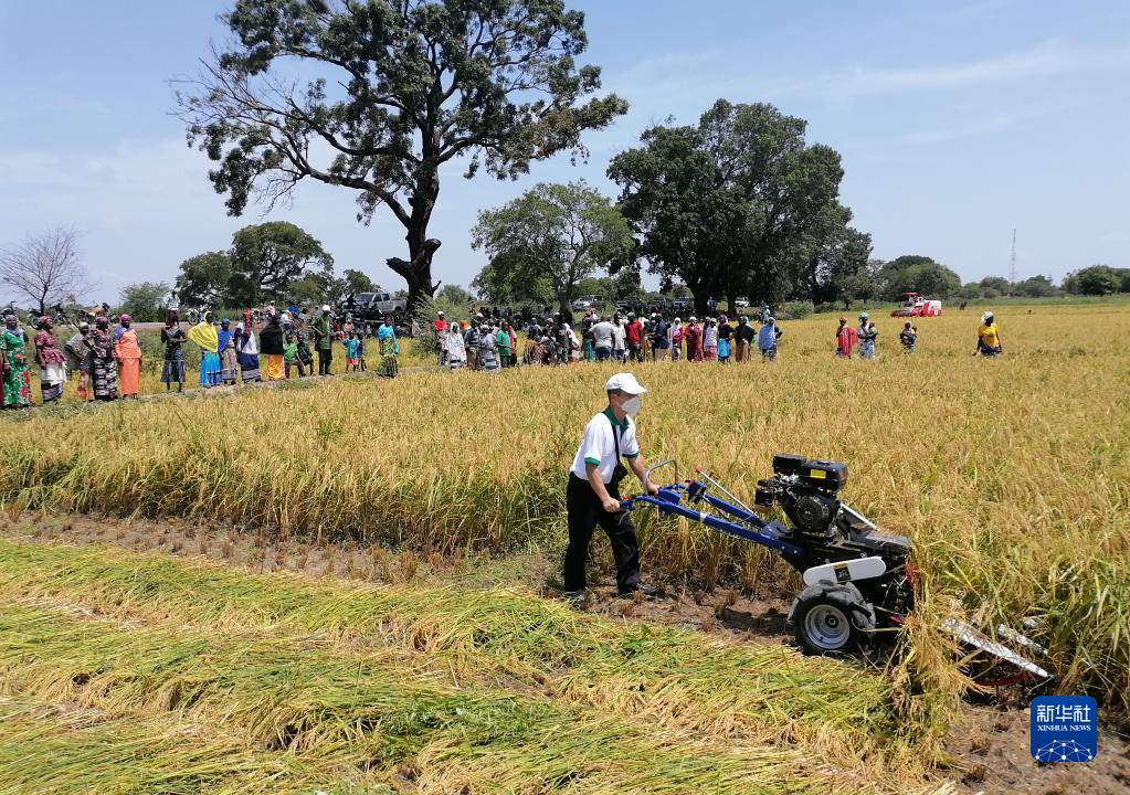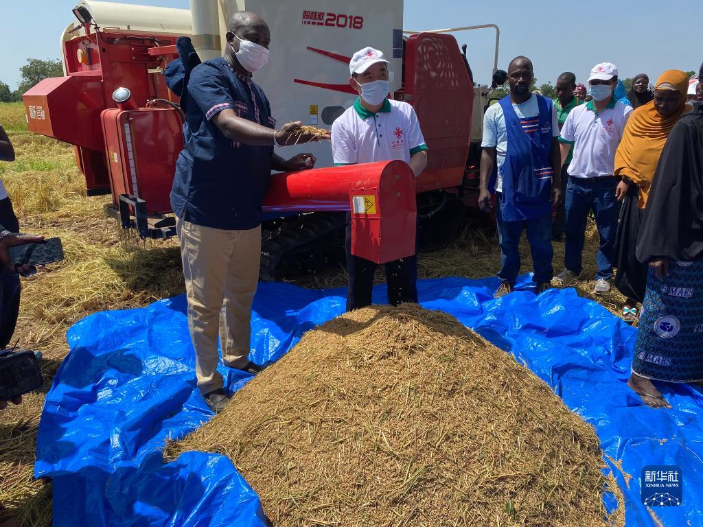 这是2021年10月8日,中国专家组成员在布基纳法索中西大区水稻示范区指导机械化水稻收割作业。新华社发(中国农业组供图)
