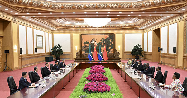 习近平强调,中方支持南非探索符合本国国情的现代化道路,愿同南非进一步夯实政治互信基础,提升互利合作水平。中方愿同南非等非洲国家一道,落实中国支持非洲工业化、农业现代化、人才培养三项举措以及高质量共建“一带一路”的八项行动,打造一批高标准、惠民生、可持续的合作项目,提升中非合作的战略性和可持续性,推动构建高水平中非命运共同体。双方应继续密切在金砖国家机制内合作,加强发展中国家团结合作,推动全球治理体系朝着有利于发展中国家的方向发展。