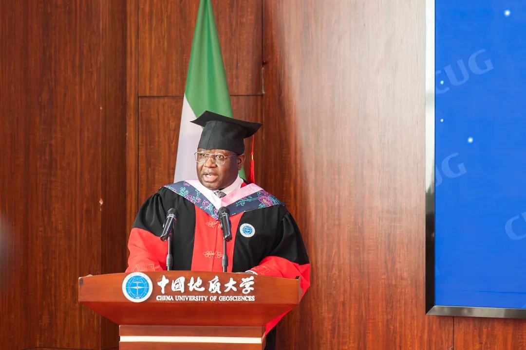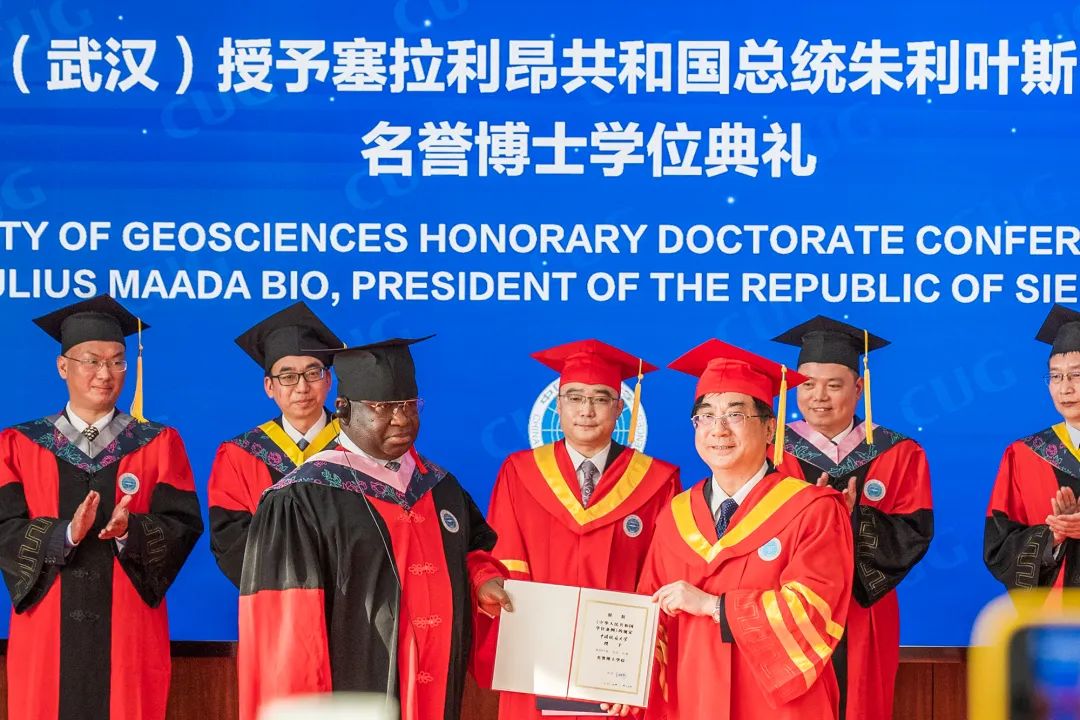 中国地质大学(武汉)校长王焰新为比奥总统颁发名誉博士学位证书并拨穗,副校长王力哲宣读了国务院学位委员会“关于同意授予朱利叶斯·马达·比奥名誉博士学位的决定”。